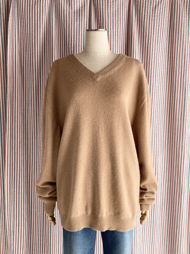 こちらは1990年代のカシミヤVネックニットセーターです。カラーは濃いベージュです。 ベージュは個人的にも好きなカラーで、中でもプレーンなベージュのニットは形や素材を問わずクローゼットにお店に、定番としても揃えておきたい普遍の魅力があります。着心地と暖かさが最高のカシミヤ生地なんて尚更です… そしてウール生地の商品でお馴染みのPENDLETONにもカシミヤが存在するんですね〜タグの表記が英語と日本語両方という点から、当時は日本でも販売された物と思われます。メンズ仕様でゆったりとしたシルエットなので例えばご家族と兼用も良いですね。 生地の質感が上手く撮影できなかったのですが、実物は画像の印象より表面がほわほわとして毛羽立ちがあります。以前の持ち主が雑に洗濯機で回し、なんなら乾燥機までかけてしまったせいかもしれない?(笑)古着のカシミヤらしい繊細なシャギー感は味があって好きです。 高級な生地に位置するカシミヤではありますが、毛玉ができても穴が空いても気にし過ぎない、ロンTやスウェット感覚のゆるい付き合い方もお洒落だと思います。良い生地の古着だからこその楽しみ方ですよね♪ ウールも洗える洗剤であれば、手洗いや洗濯機にてお家でお洗濯可能です。こちらのセーターは畳んでネットに入れ、洗濯機の優しく洗うコースにて洗濯しました。脱水は1分程、干し方は平干しがお薦めです。 ※実物の発色は画像1〜5が近いです。 ※セーター以外はスタッフの私物です。 ※画像のトルソーは身長約165㎝・バスト約84㎝・ ウエスト約64㎝・ヒップ約90㎝です。ハンガーは幅 約38㎝です。 【ダメージ】 ⚫︎目立つダメージはございません。 【サイズ】 ⚫︎表記サイズ メンズL ⚫︎着丈 約69㎝(背中側中心の襟リブ端から裾リブ端までの長さ) ⚫︎肩幅 約54㎝(肩の袖付け根の頂点から反対側の頂点までの直線の長さ) ⚫︎身幅 約58㎝(脇の下から反対側の脇の下までの 長さ) ⚫︎袖丈 左袖約68.5㎝ 右袖約67.5㎝(肩の付け根の頂点から袖リブ端までの長さ) ※全て平置きの採寸です。僅かな誤差が生じる場合がございますが予めご了承ください。 【商品の古着・お問い合わせについて】 古着は状態を厳選し洗濯や補修を施しておりますがダメージが見られたり、生地や縫製の質が高くないものもございます。以上の点をご理解いただきご購入後に予想される色落ちやほつれ等の経年変化も、古着の魅力の1つとして楽しんでいただければ幸いです。 頻繁な着用も避けていただくと長持ちいたします。 お問い合わせは⚫︎CONTACTページ⚫︎Gメールの[email protected]宛⚫︎インスタグラムのDMのいずれかからご連絡ください。 メールは返信の為「thebase.in」と「gmail.com」のドメイン指定受信許可をお願いいたします。 返信にお時間をいただく場合がございます。予めご了承ください。 【お支払いについて】 お支払いはクレジットカード決済、またはキャリア決済からお選びいただけます。 クレジットカード決済はご一括払いのみご利用いただけます。キャリア決済はお支払い手数料¥300円がお客様のご負担となります。予めご了承ください。 商品を複数点お求めの場合、ご注文も複数回に分けてしまいますと送料が個別に発生いたしますのでご注意ください。 ご注文後BASEよりご注文情報メールが届きます。 お支払い明細には「BASE YURI」または「ベイス」と記載されます。 納品書・領収書は発行しておりません。領収書はクレジットカード会社・キャリアのご利用明細を代わりとしてご利用ください。 【送料・配送について】 送料は税込み表記になります。詳細は下記の「送料・配送方法について」のページからご確認ください。 ご注文確定後の翌日から土日祝日を除いた3営業日以内に発送いたします。配送地域は国内のみとさせていただきます。 【キャンセル・返品について】 大変申し訳ありませんがご注文確定後のキャンセルや変更はお受けできません。また商品説明文や画像と、配送後の商品の印象や色味等が異なる場合がございますが、古着の特性上返品や交換はお受けできません。 以上の点をご理解とご了承いただき、ご注文の前に商品説明文や画像から慎重にご検討ください。 ※YURIオンラインショップからのお知らせはHOMEページにて随時掲載いたしますのでご確認ください。