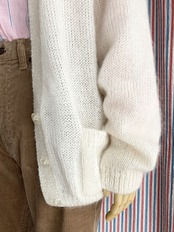何でもないVネックカーディガンをアレンジした感じが好きです。このタイプはゆるい編み目とシルエット、大きく開いた前開きの先にポケットやボタンが集中するデザインが可愛くて、実店舗の頃も見つけたら仕入れていました。モヘア混ニットなら尚良しです♪