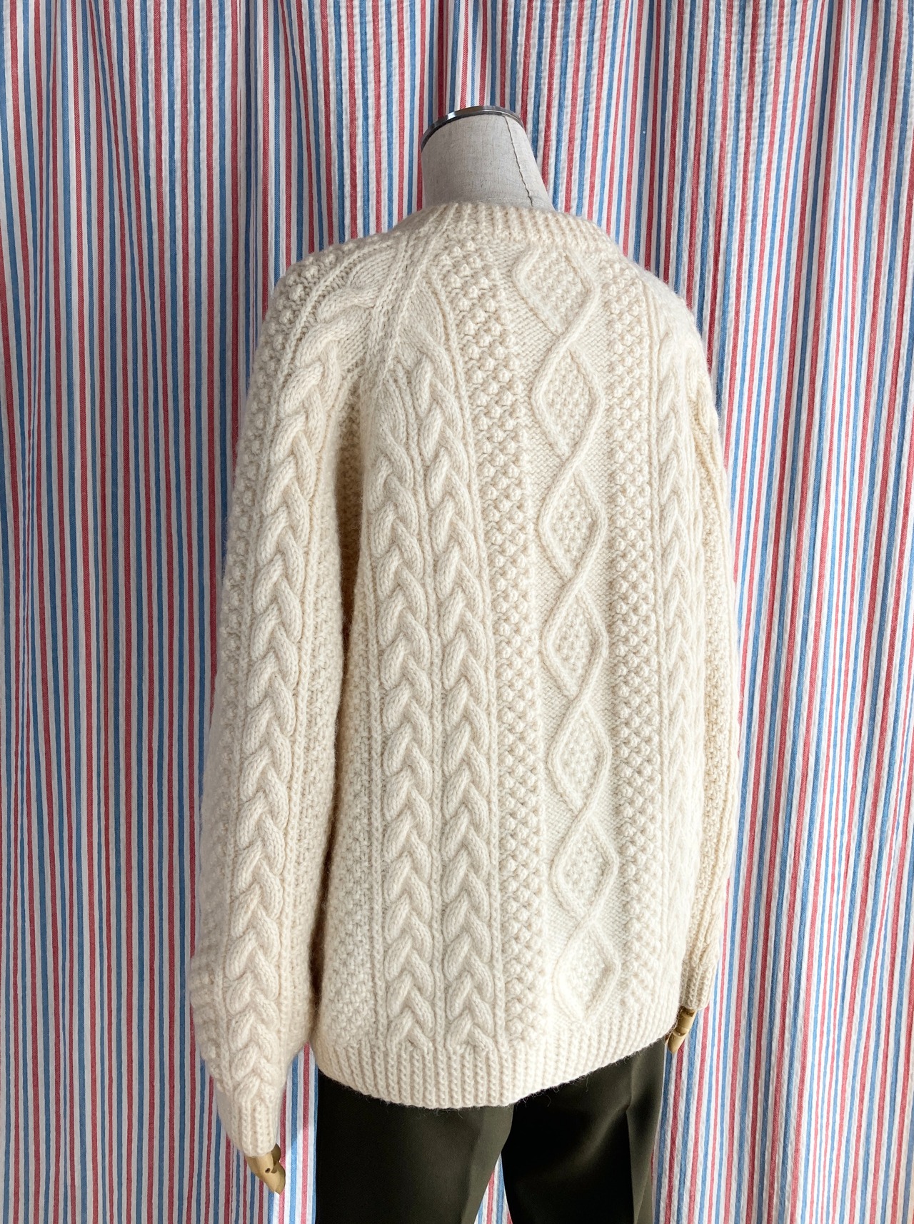 こちらのセーターは実店舗を営業していた時の商品です。アランニット等のケーブル編みのニットは僕も大好きだったので、お店でも毎シーズン厳選しながら扱っていましたが、このセーターは残念ながら旅立つ事が叶いませんでした、、