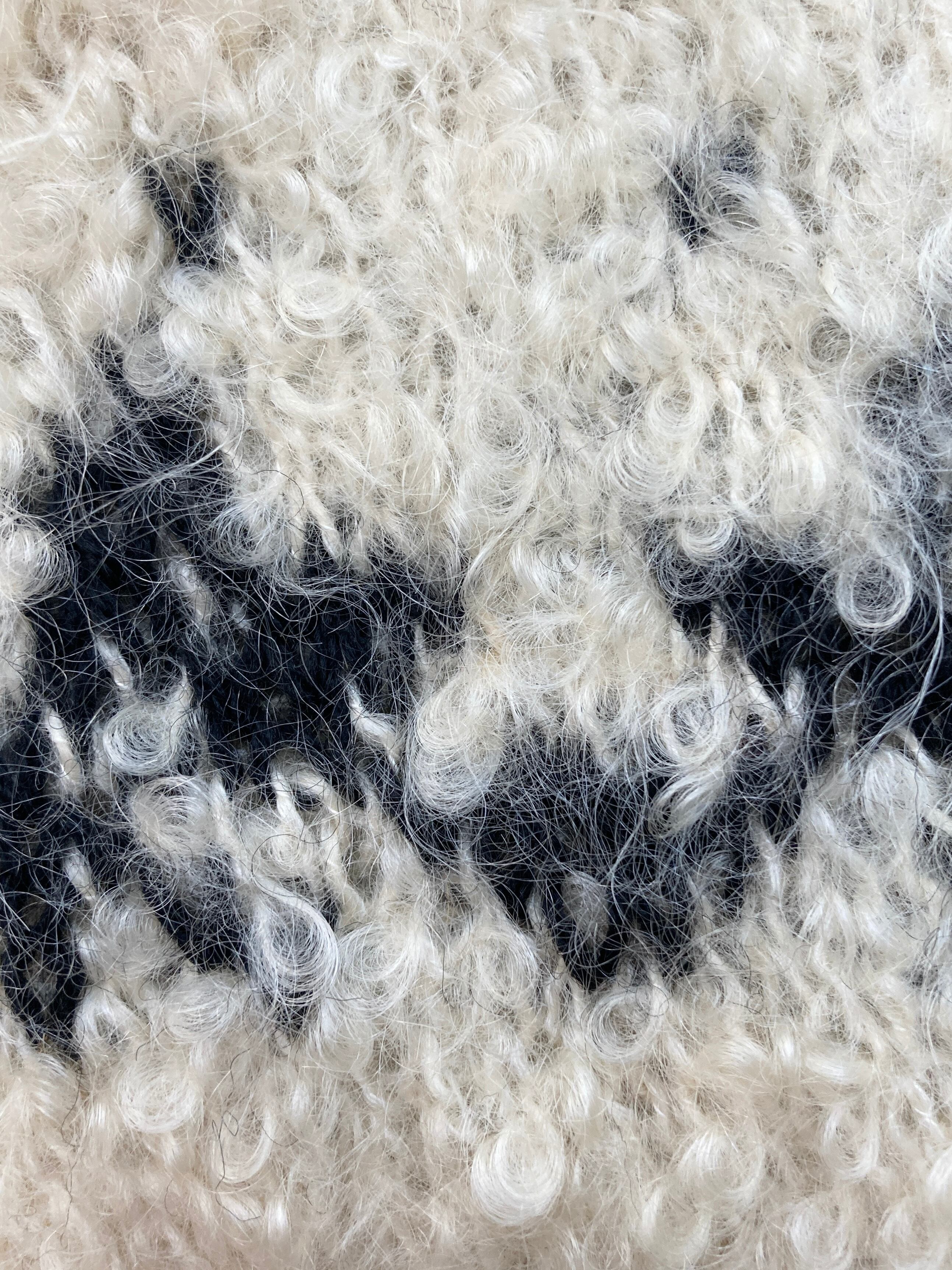 モヘアは毛足が長く細かい柄は見えにくくなる為か、柄が入るタイプのチロリアンニットではあまり使われません…しかしこちらはかなり長毛のモヘア、さらにくるくるの巻き毛です。表面はよりモフモフで、チロリアンニットの売りである柄も埋もれています(笑)