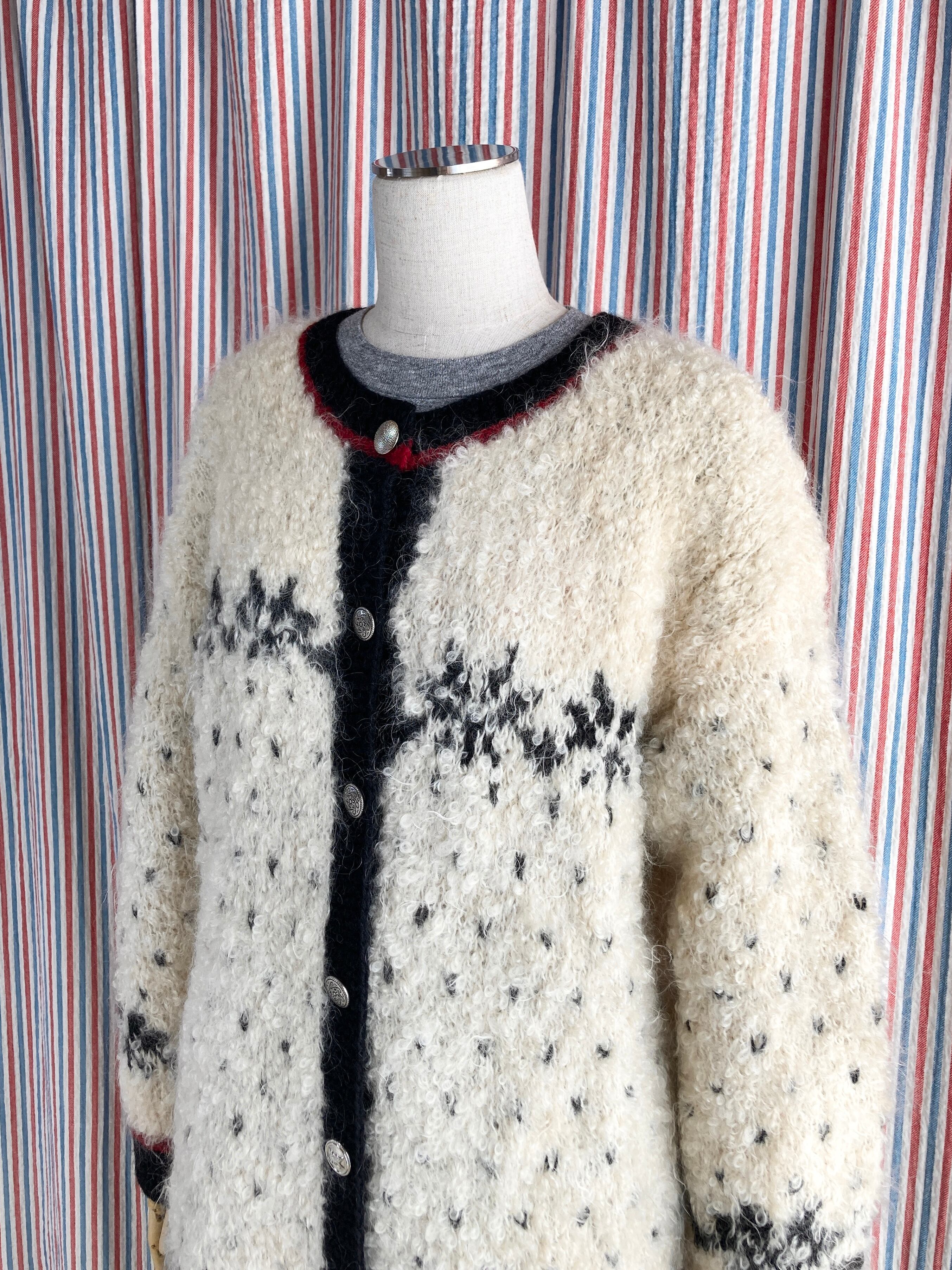 ノーカラータイプの襟に雪?柄やバーズアイ柄、花の紋様のメタルボタン等はヨーロッパのチロリアンニットによく見られますが、今回の最大のポイントはそれらの伝統的なディテールを使いながら、生地に巻き毛のブークレモヘア生地を選んでいる点です。