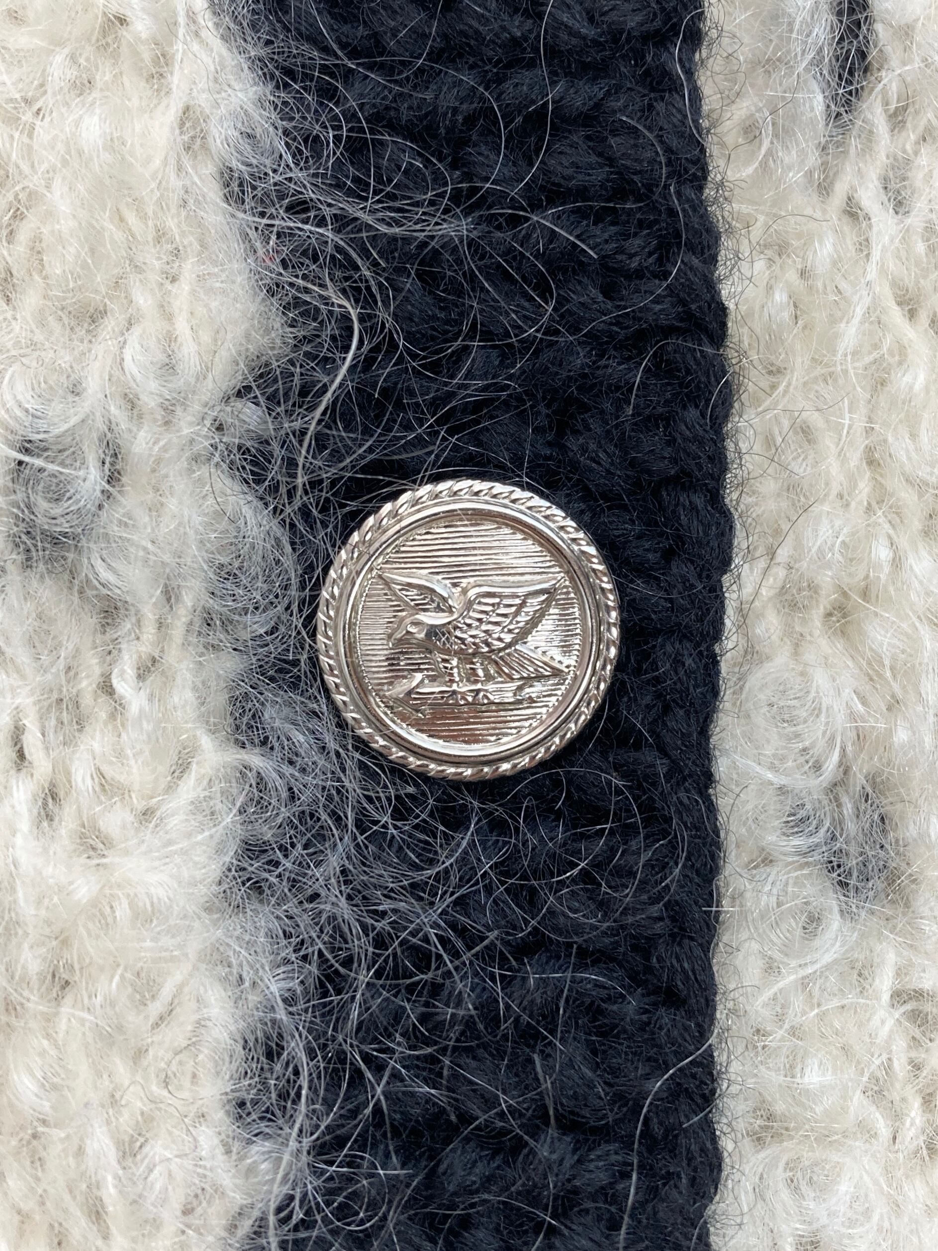 また第1・第5ボタンが欠損していた為、替わりに古いボタンを付けました。お気に入りのボタンでした(笑)裏側の黒い毛糸が外れている部分は着用に問題は無い為そのままにしていますが、何かに引っ掛けないよう少しだけ手かがりして留めておいてもよいかと思います。