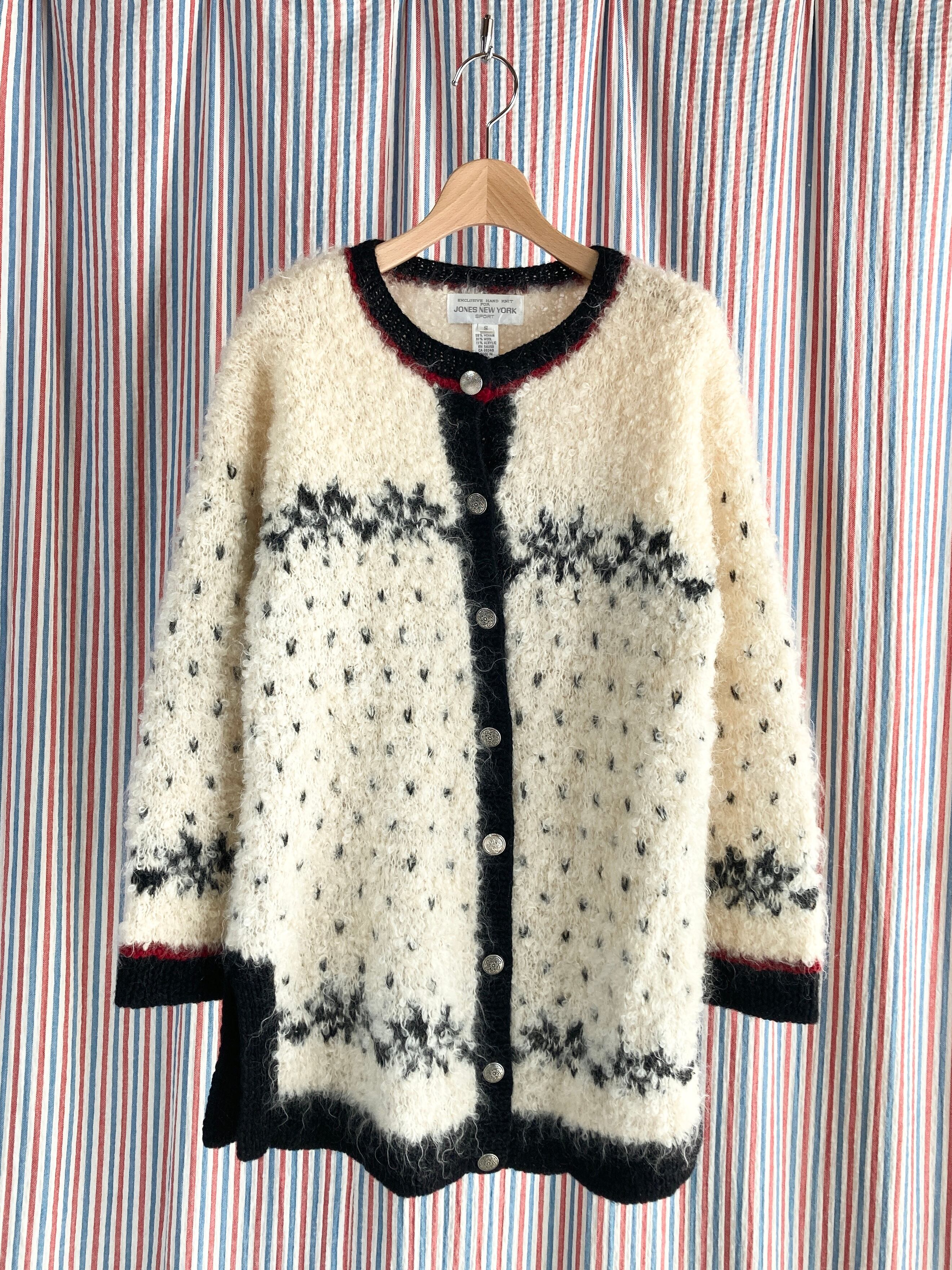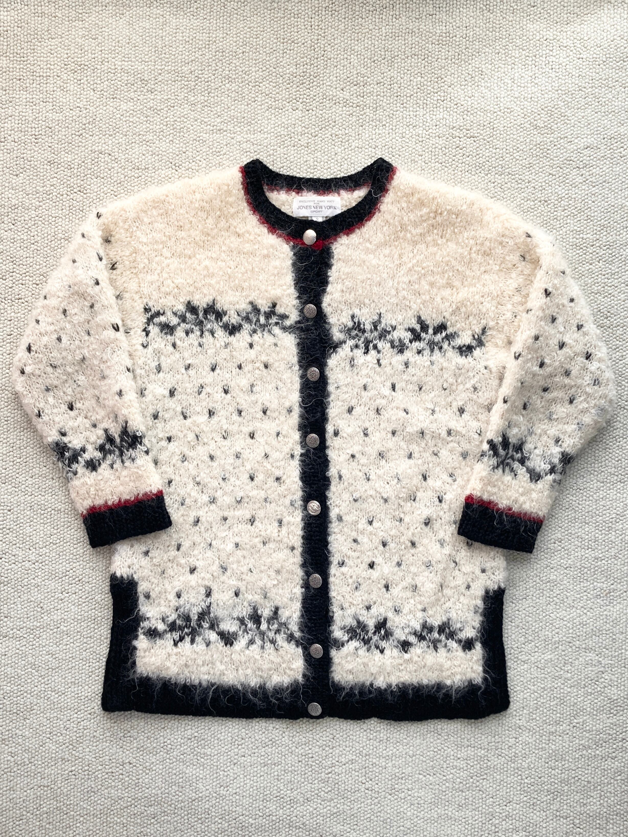 こちらは1990年代のJONES NEW YORKニットカーディガンです。生地はモヘアとウール、アクリルの混合です。
