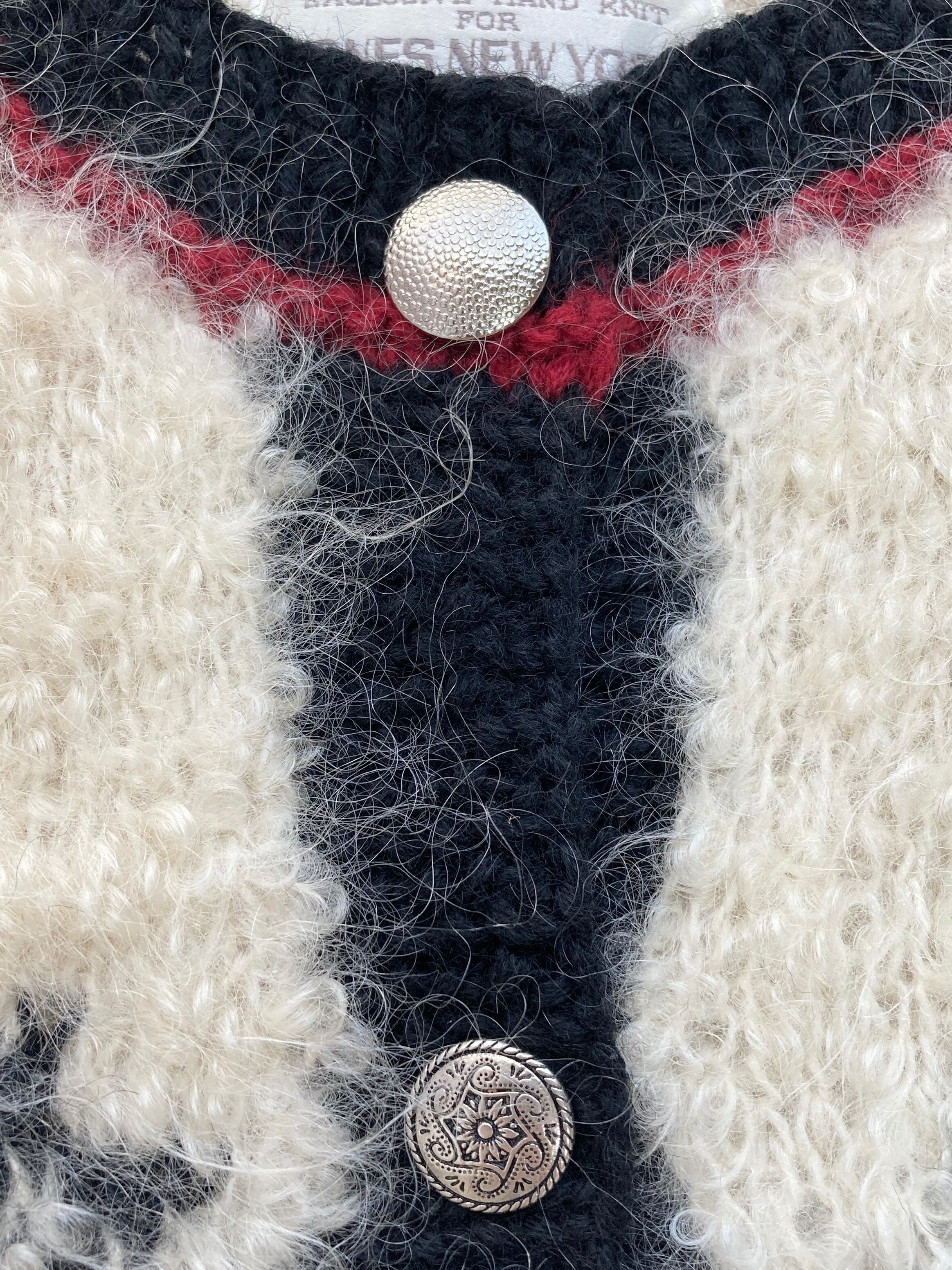 着丈が長く裾にスリットが入ったジャケット風のデザインもとてもモダンです。黒い部分の毛糸をモヘアと変えている点も、白いモヘアの毛足を強調しながら全体の印象を引き締めています。見れば見る程お洒落なカーディガンです、、